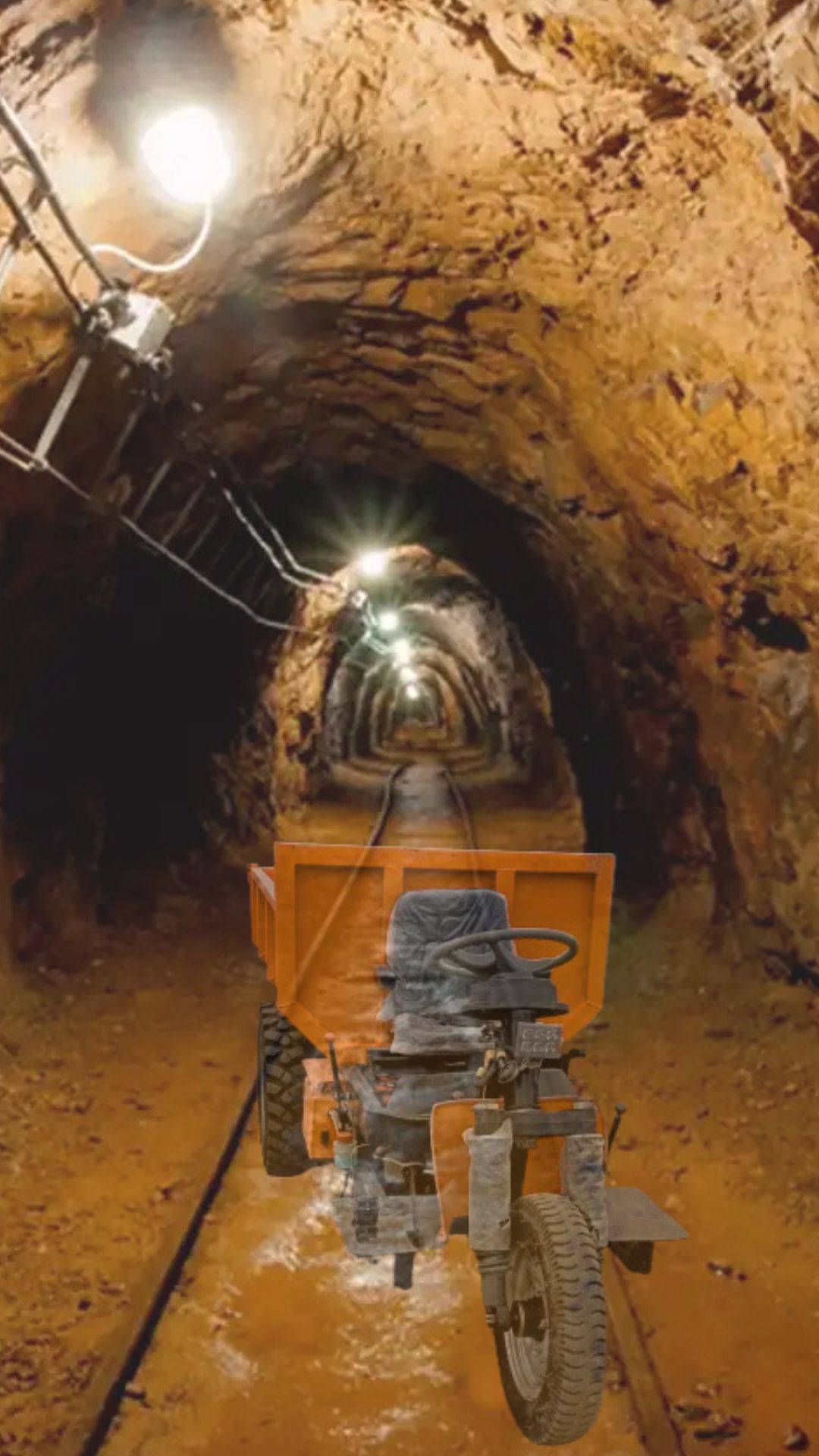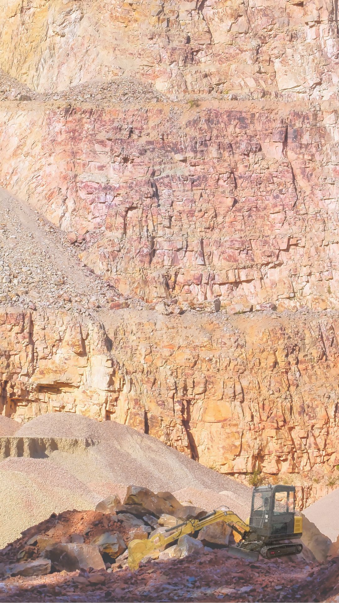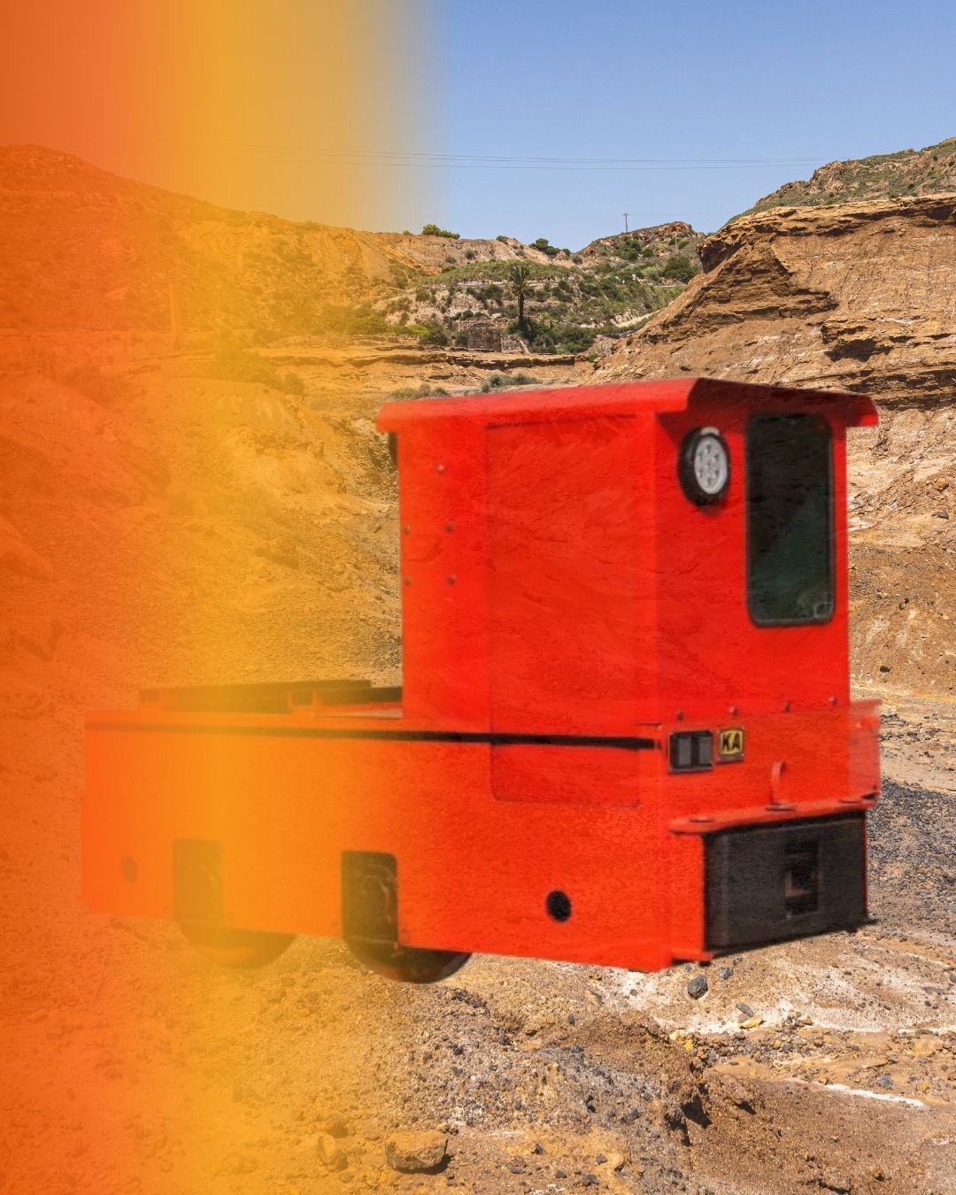 Mineros trabajando en una mina a cielo abierto, usando diferentes herramientas y equipos como minidumpers eléctricos, palas, cargadoras y cascos de seguridad.